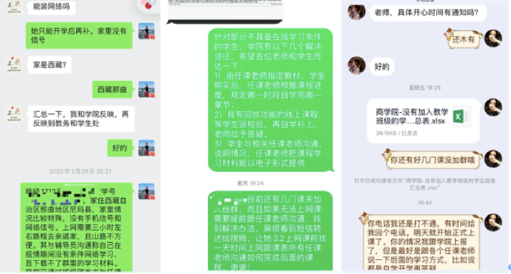 在摸排统计学生网络课程准备情况的时候,学院了解到能源经济专业一位家在西藏偏远山区的困难学生家里没有信号,也没有网络覆盖,无法参加线上教学活动。学院辅导员李晴及时与学生沟通,一起梳理本学期的课表信息,安排班级骨干及时将不能参加线上教学学生情况与任课教师沟通,积极寻找解决办法。同时,辅导员将她的情况上报到学院和教务处,学院领导关心关注,建议她在家积极开展自学,开学后任课老师给予答疑帮助。考虑到学生的家庭特殊情况,学院后续将通过临时困难补助等方式给予一定帮扶。