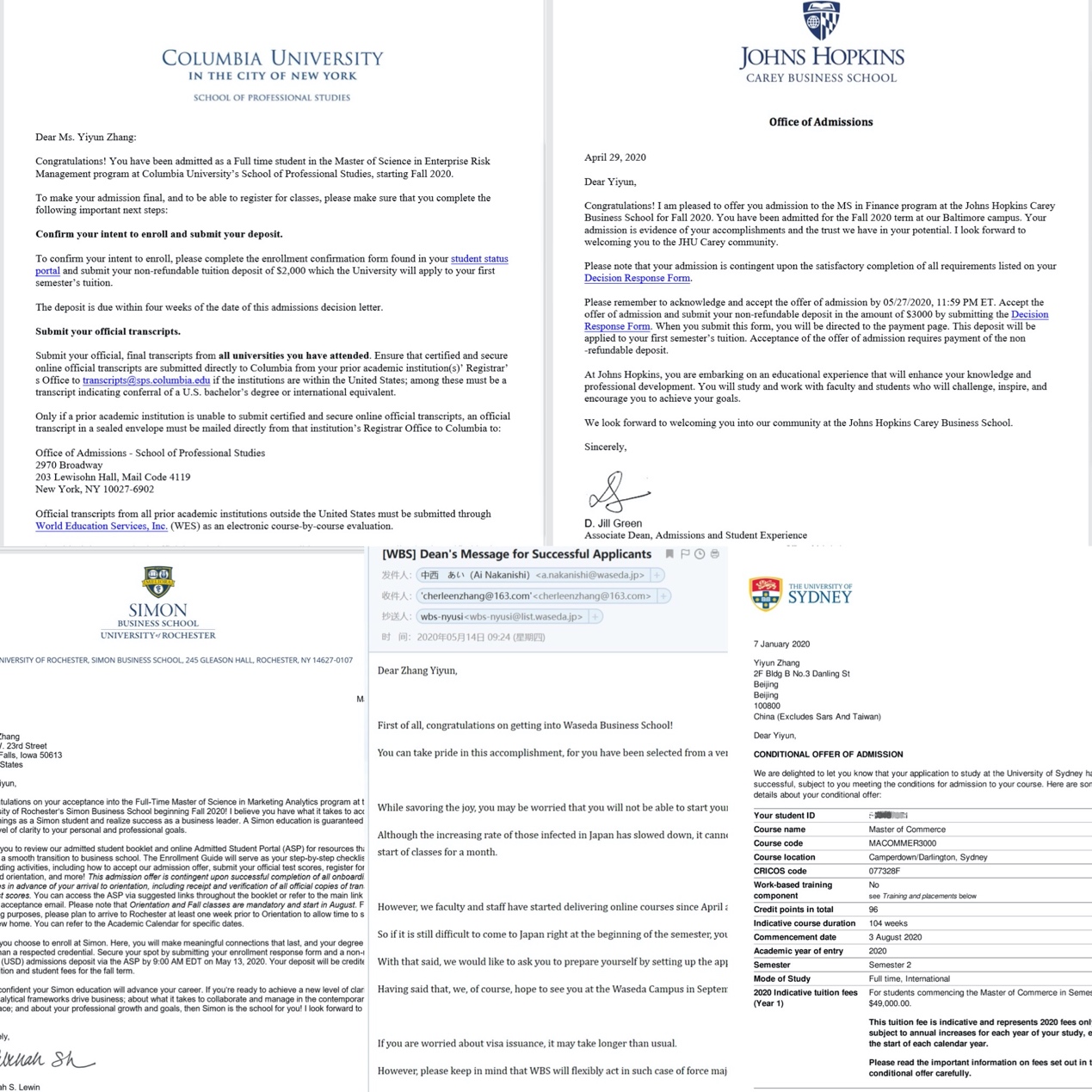 近日顺利从beat365亚洲版官网与北爱荷华大学的2+2中外合作项目中毕业的beat365亚洲版官网国贸1621班张逸云同学,陆续收到来自美国的哥伦比亚大学,约翰霍布金斯大学,澳洲悉尼大学,日本早稻田大学等国外知名大学的研究生录取通知。一份耕耘,一分收获,追梦路上,她从未停止奋斗的脚步。