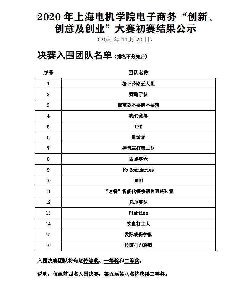 此次比赛,展示了当代大学生们对创新、创业、创意的众多想法。其中不乏一些成熟和优秀的项目,对于选手们来说是一次相互学习的宝贵机会。以下附初赛结果公示:
