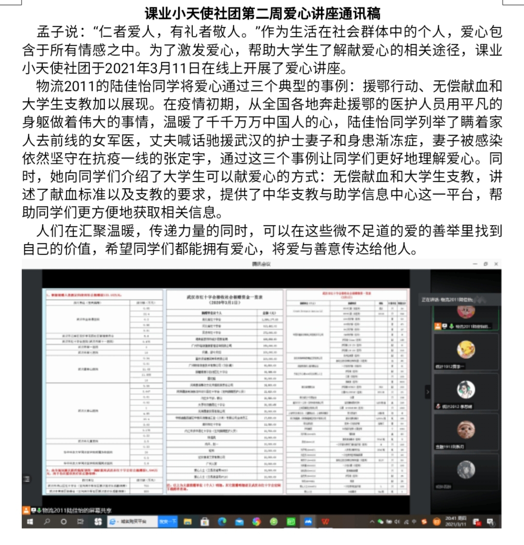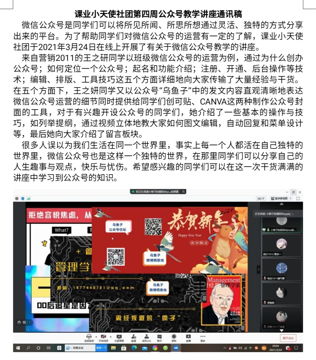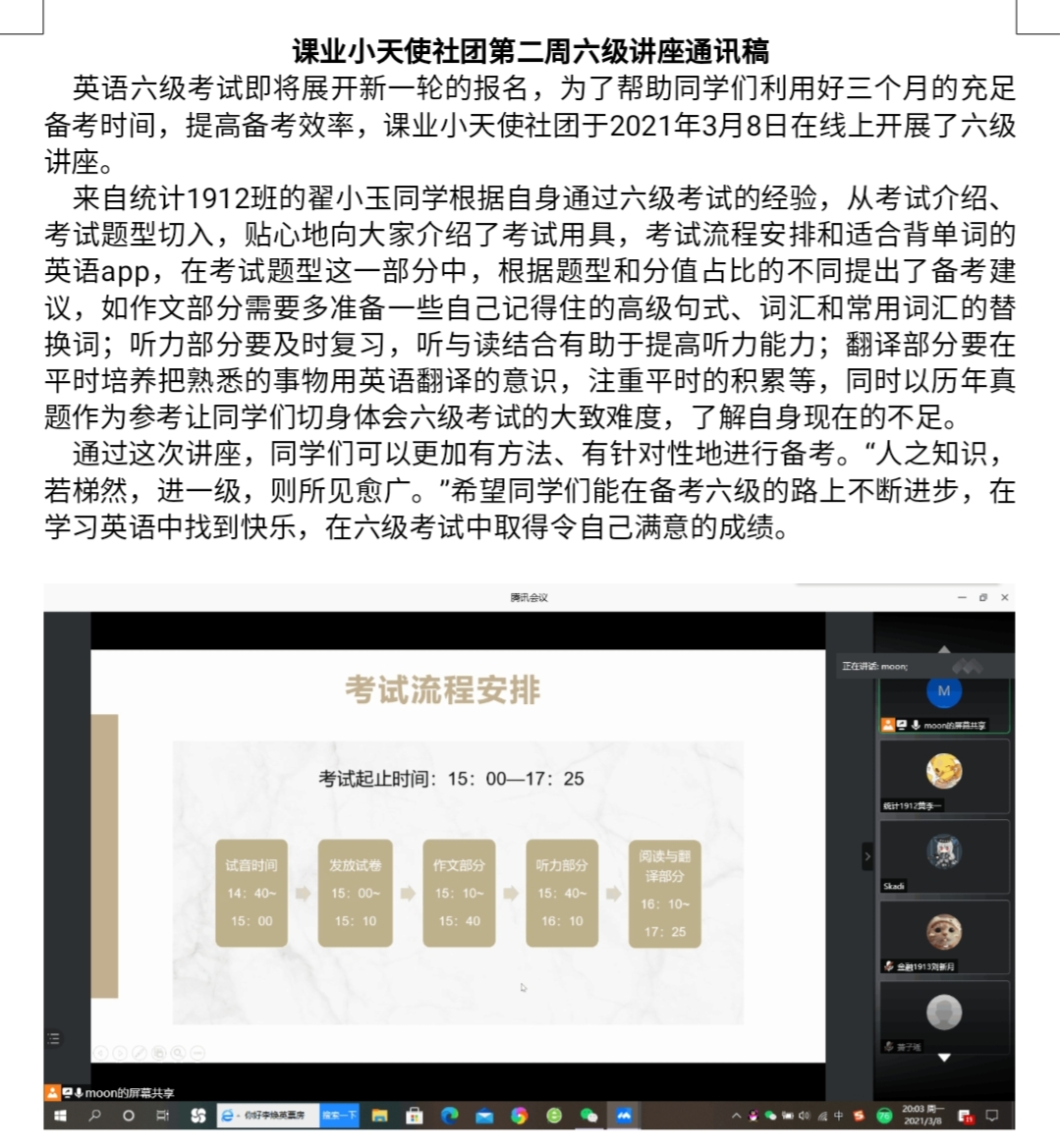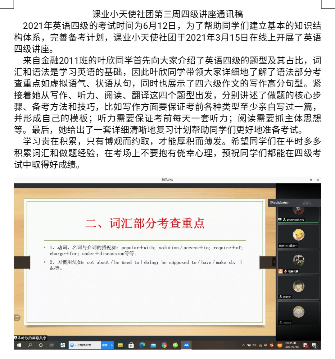 除此之外,为适应不同年级学生的需求,每周三我们会有针对大一学生开展的四级线上讲座,可以让闵行的同学参加,同时讲座由英语基础良好的大一同学开办,不仅锻炼了同学的英语水平,还锻炼了同学的口才和表达能力。希望通过接下来几周的社团活动,我们能够提高同学四六级通过率,提高英语的写作、翻译、阅读各个方面的水平,建设beat365亚洲版官网良好学风。