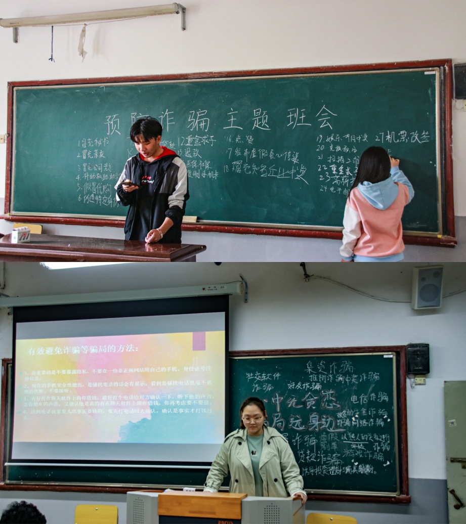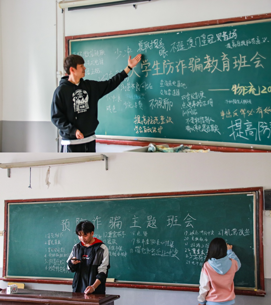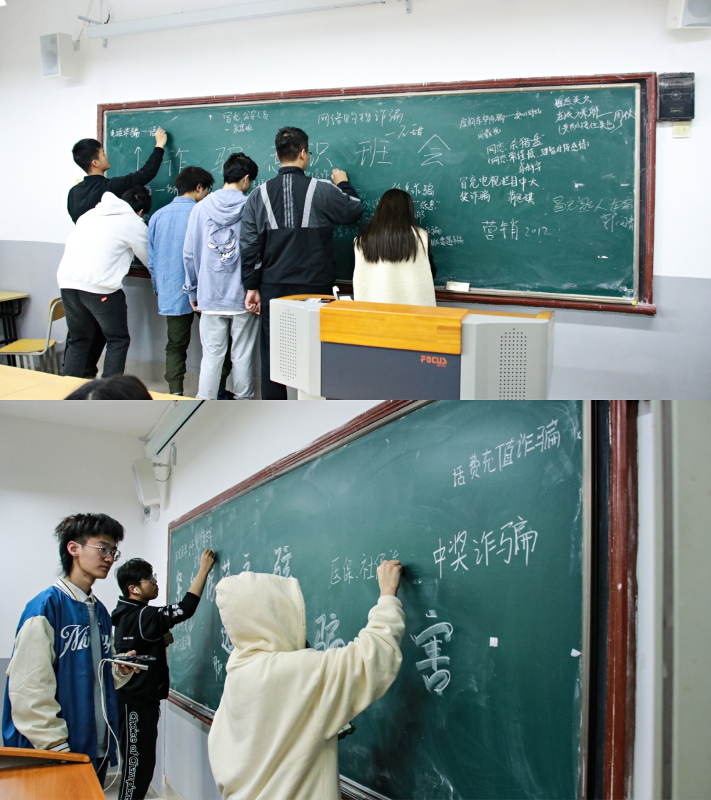 班会中,班委成员通过资料搜集和亲身经历分享讲解了各类电信诈骗的典型案例,分析了电信诈骗的主要手段和方式方法。为调动每一位同学参与的积极性,在班会过程中,每位同学都走上讲台,在黑板上写下一种诈骗方式,并分析如何防止被这种诈骗方式欺骗。通过全员参与,全员分享,最大限度提升了广大学生防诈骗意识。