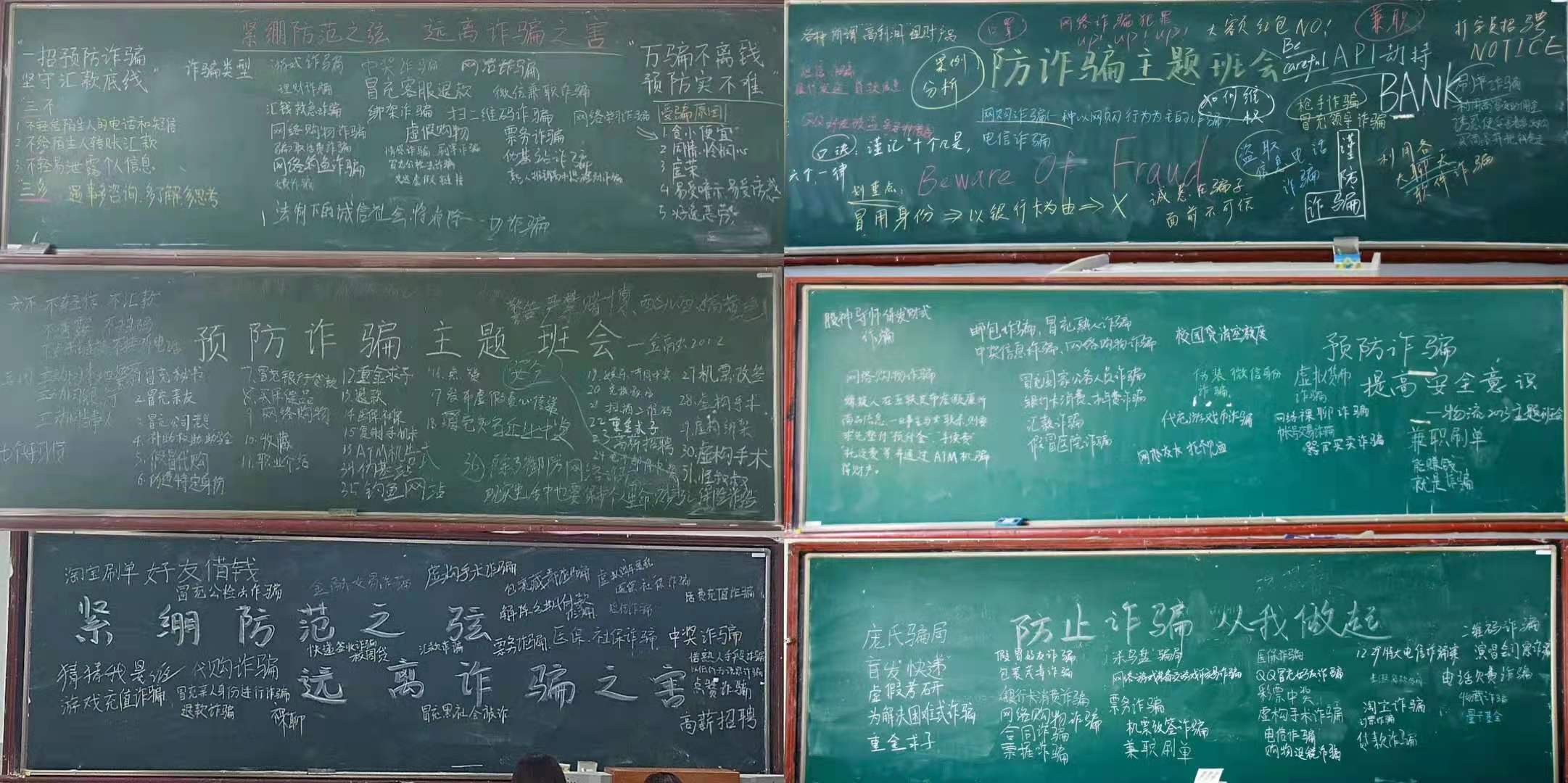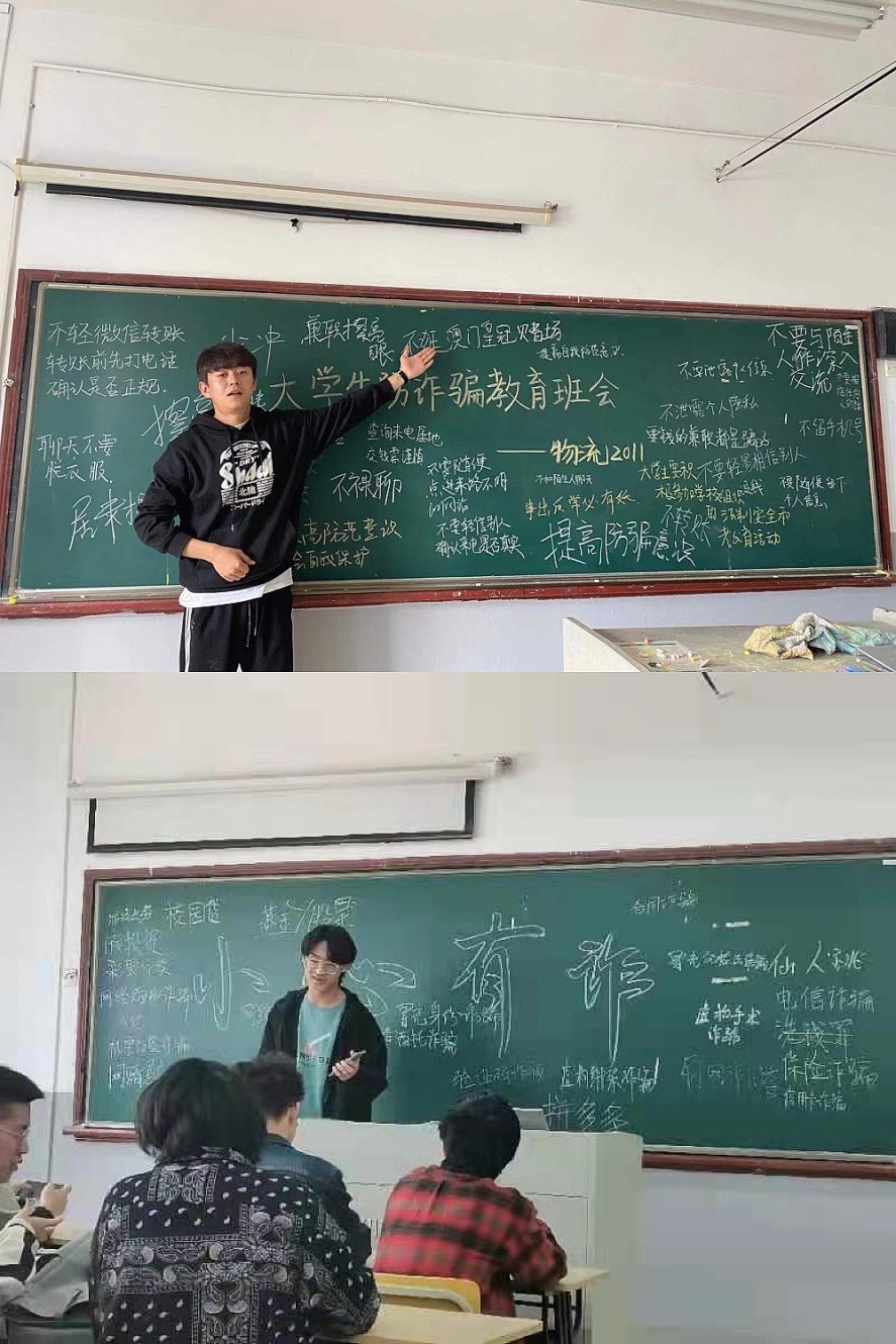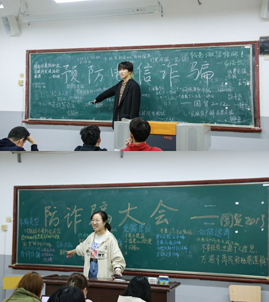 班会中,班委成员通过资料搜集和亲身经历分享讲解了各类电信诈骗的典型案例,分析了电信诈骗的主要手段和方式方法。为调动每一位同学参与的积极性,在班会过程中,每位同学都走上讲台,在黑板上写下一种诈骗方式,并分析如何防止被这种诈骗方式欺骗。通过全员参与,全员分享,最大限度提升了广大学生防诈骗意识。