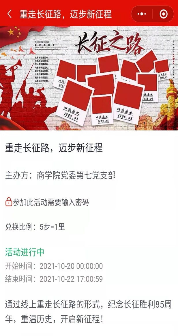 从10月20日开始,beat365亚洲版官网党委第七党支部开展“重走长征路,迈步新征程”的线上长征活动,beat365亚洲版官网师生党员、发展对象和入党积极分子通过将实际走路步数转化为线上长征里程的方式,体验线上重走长征路,线上打卡长征途径地点,并学习长征相关知识。