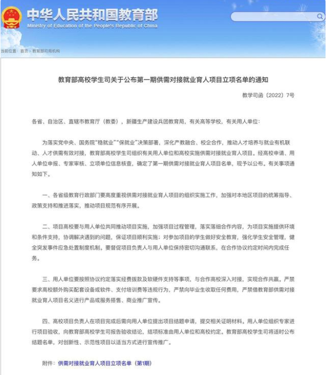 供需对接就业育人项目指南征集工作于2021年8月启动,共有347家用人单位提交项目指南,分为定向人才培养培训、就业实践实习基地建设、人力资源提升三类。其中,就业实践实习基地建设项目由高校与用人单位共建就业实践实习基地,以期为高校毕业生提供实习岗位,帮助毕业生通过实习实现就业。