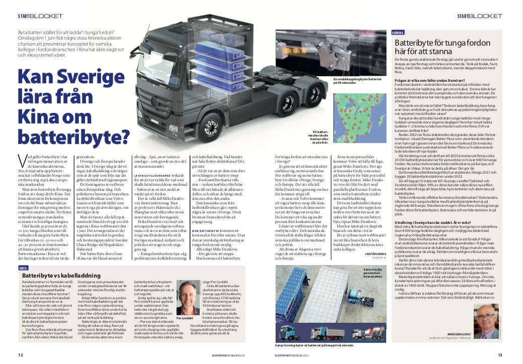 6月14日,瑞典专业媒体《Electronics and Electrics Newspaper》用了两个整版篇幅,以“瑞典能否向中国学习换电模式?”为题对6月1日召开的中国-瑞典换电重卡高端研讨会进行了深度报道。报道对该研讨会及中国企业在换电重卡领域的实践和成就给予了高度评价, 并指出虽然目前瑞典政府有意发展电气化道路,但瑞典市场对经济高效的电动重卡的需求已经很迫切。中国首创的换电重卡解决方案,打造了完整的产业链,并已经成功实现了上百个项目的商业化落地和良好运行,值得瑞典学习。