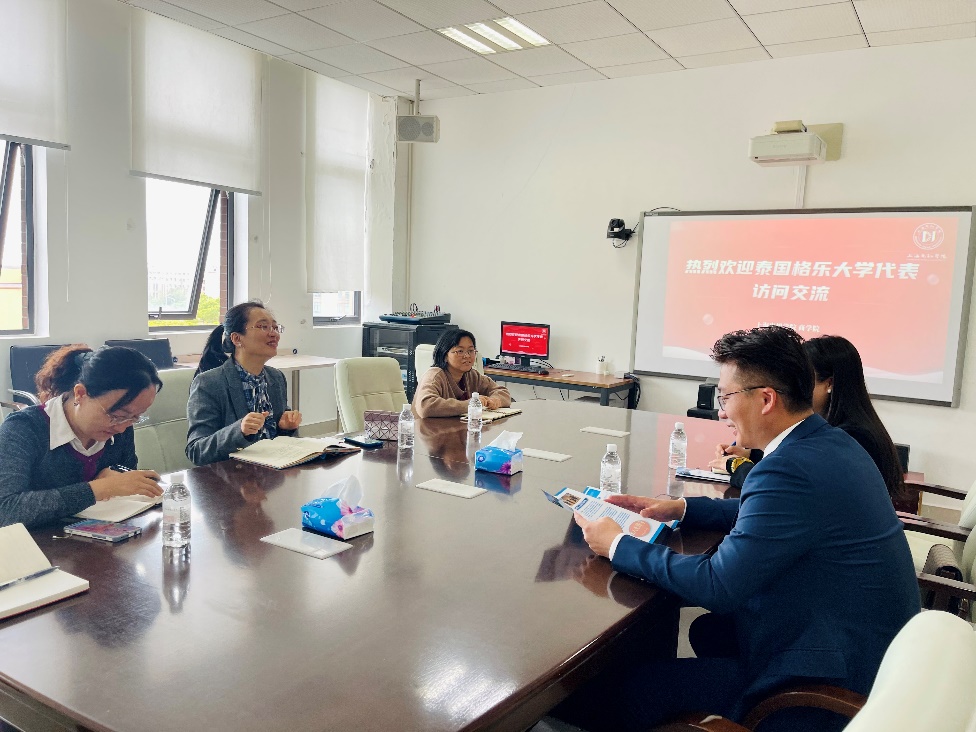10月20日,泰国格乐大学国际事务中心主任桂学诗、副主任刘佳丽一行来访beat365洽谈合作。校国际合作与交流处副处长彭睿睿,beat365亚洲版官网党委副书记、副院长沈瑾以及其他负责相关工作的老师于商院楼512室接待了来访团。