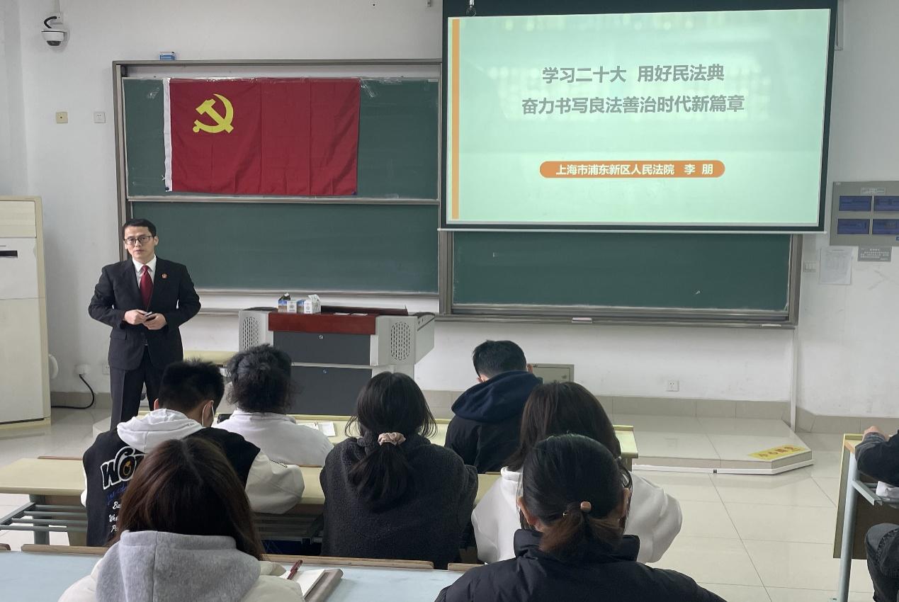 在临港校区,浦东新区人民法院李朋法官以《学习二十大 用好民法典 奋力书写良法善治新篇章》为题开展第一讲,李朋法官结合丰富时事案例,向学员们详细介绍了民法典的内容,提升了学员们的法治思维和法治意识。