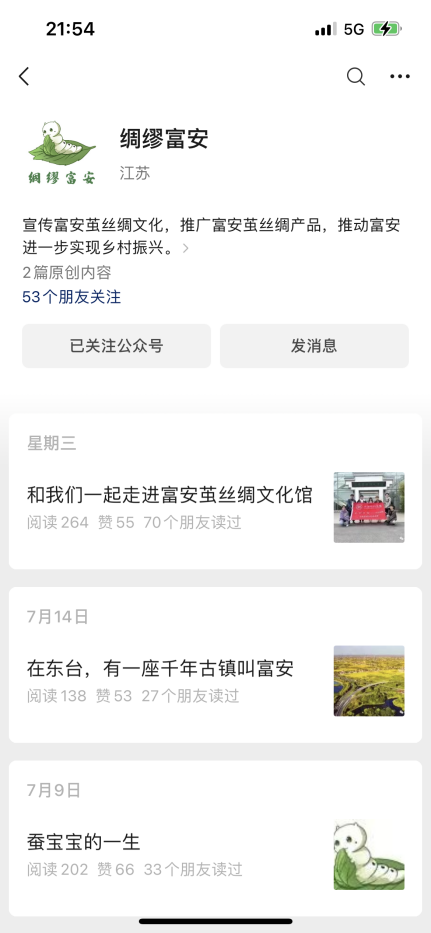 同时,自实践团成立以来,团队成员通过微信公众号和抖音等线上方式,同步对富安茧丝绸进行宣传。2023年5月以来,先后创建了微信公众号和抖音账号“绸缪富安”。截至目前,“绸缪富安”微信公众号已发表原创推文五篇,“绸缪富安”抖音账号已发布视频四条,两平台账号均获得了可观的浏览量、点赞量和关注量。