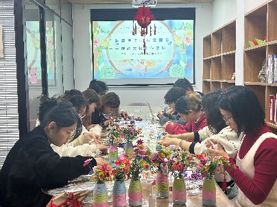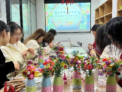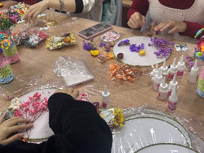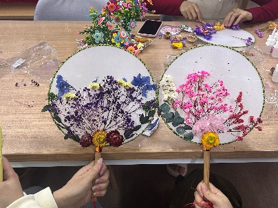 活动现场,学生干部为大家准备了剪刀、胶水、扇子等材料,并现场讲解了团扇的发展历史和团扇的形状、永生花的保存方式及特点……在一番学习和了解过后,同学们正式开始制作。大家充分发挥想象力,不拘一格,融入自己的想法,细细构图,几片叶子,数朵干花,细心粘贴,一把把平平无奇的扇子瞬间变得“高雅”起来,整个活动现场充满了欢乐的气息。