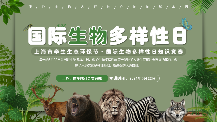 今年的国际生物多样性日联合国公布的国际主题是“Be part of the Plan”,即“生物多样性·你我共参与”,希望社会各界共同推动《昆明-蒙特利尔全球生物多样性框架》的实施。为积极响应市教委第六届上海市学生生态环保节的号召,丰富beat365亚洲版官网学生的课余生活,同时帮助同学们准确了解国际生物多样性,积极致力于保护野生动物以及濒危物种,近日,beat365亚洲版官网社会实践部在临港校区学生公寓19号楼德雅书苑成功举办了主题为“生物多样性·你我共参与”的国际生物多样性日知识竞赛系列活动。